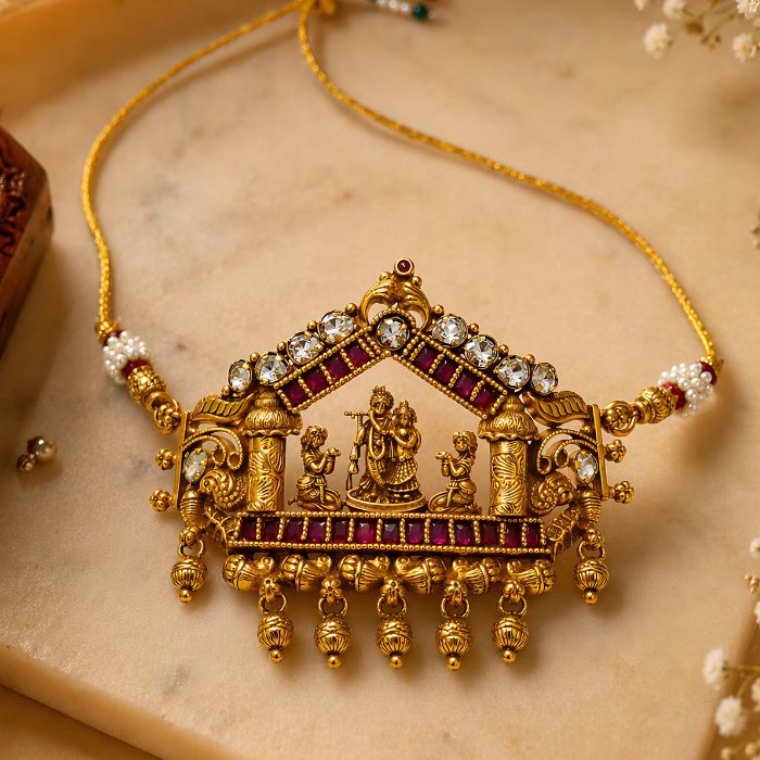 The Radha Krishna design makes this choker especially meaningful for those who appreciate devotional and temple-inspired jewellery. It works well as bridal jewellery, festive wear, or as a gift for someone who loves heritage-style accessories.