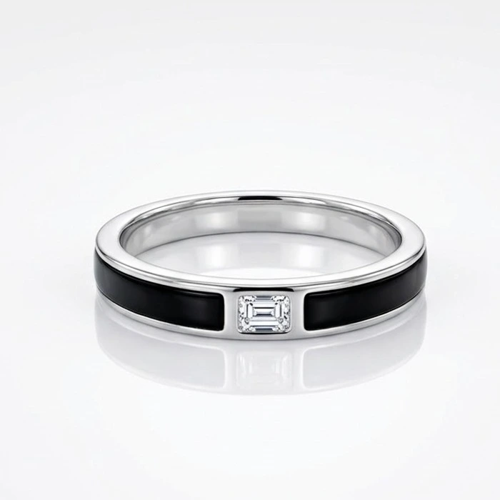 The sleek black inlay detail creates a striking contrast against the silver band, making the design stand out without being overpowering. At the center, a precisely cut emerald-shape cubic zirconia adds a subtle sparkle and a clean geometric edge.