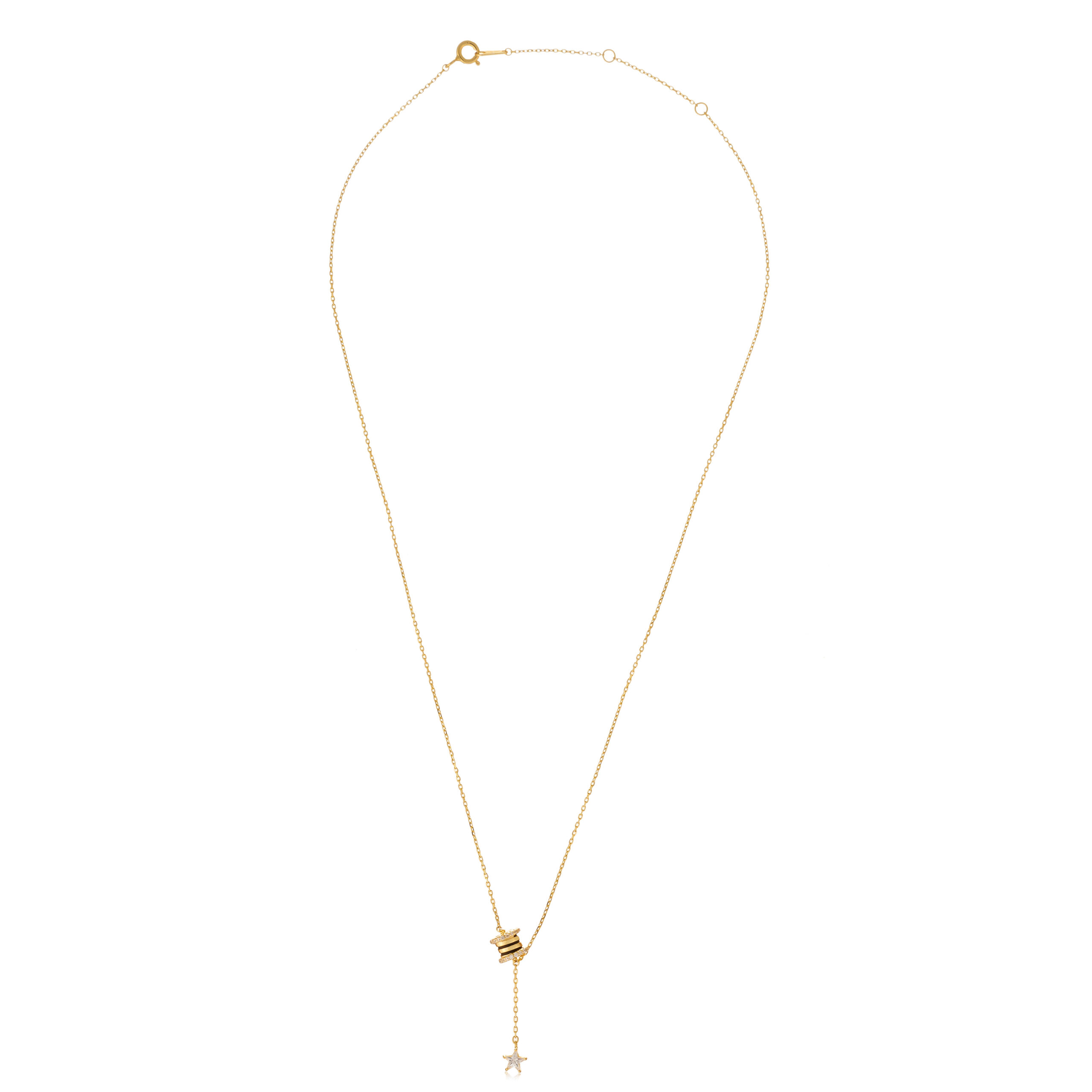 A stylish lariat necklace featuring a sparkling star pendant and a modern, rotating geometric design. A perfect blend of elegance and cosmic charm.