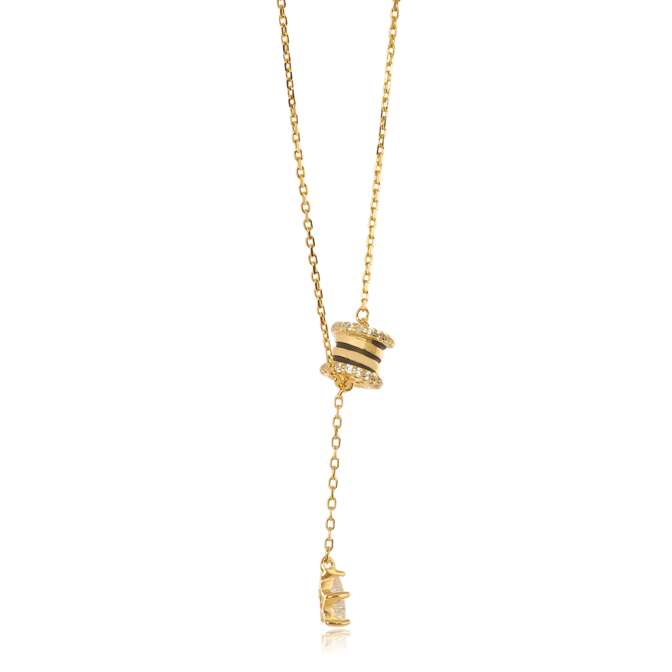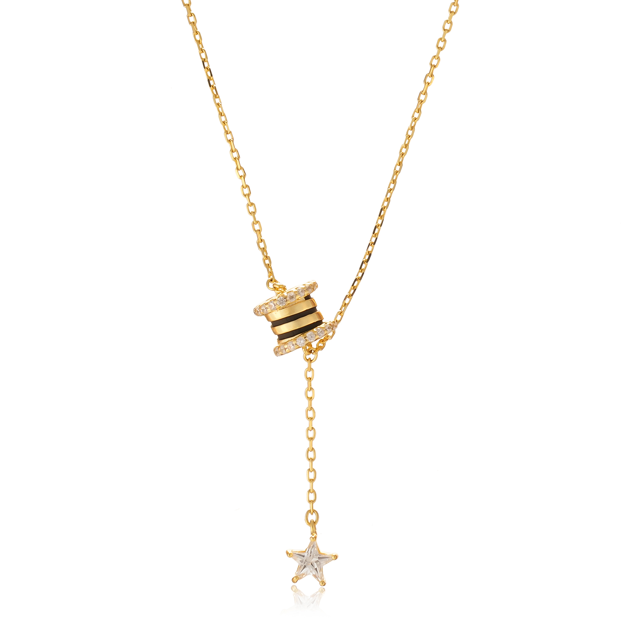The Celestial Spin Lariat Necklace from JINA brings a celestial twist to your jewelry collection. This stunning design features a unique rotating geometric pendant, adorned with sparkling cubic zirconia stones, with a delicate star charm that dangles gracefully at the end. Made with 92.5% sterling silver and plated in gold, this necklace is the perfect balance of modern elegance and cosmic allure. The adjustable chain allows you to style it to your desired length, making it versatile for any outfit or occasion. Whether worn as a statement piece or layered with other necklaces, the Celestial Spin Lariat Necklace adds a touch of celestial beauty to any look.