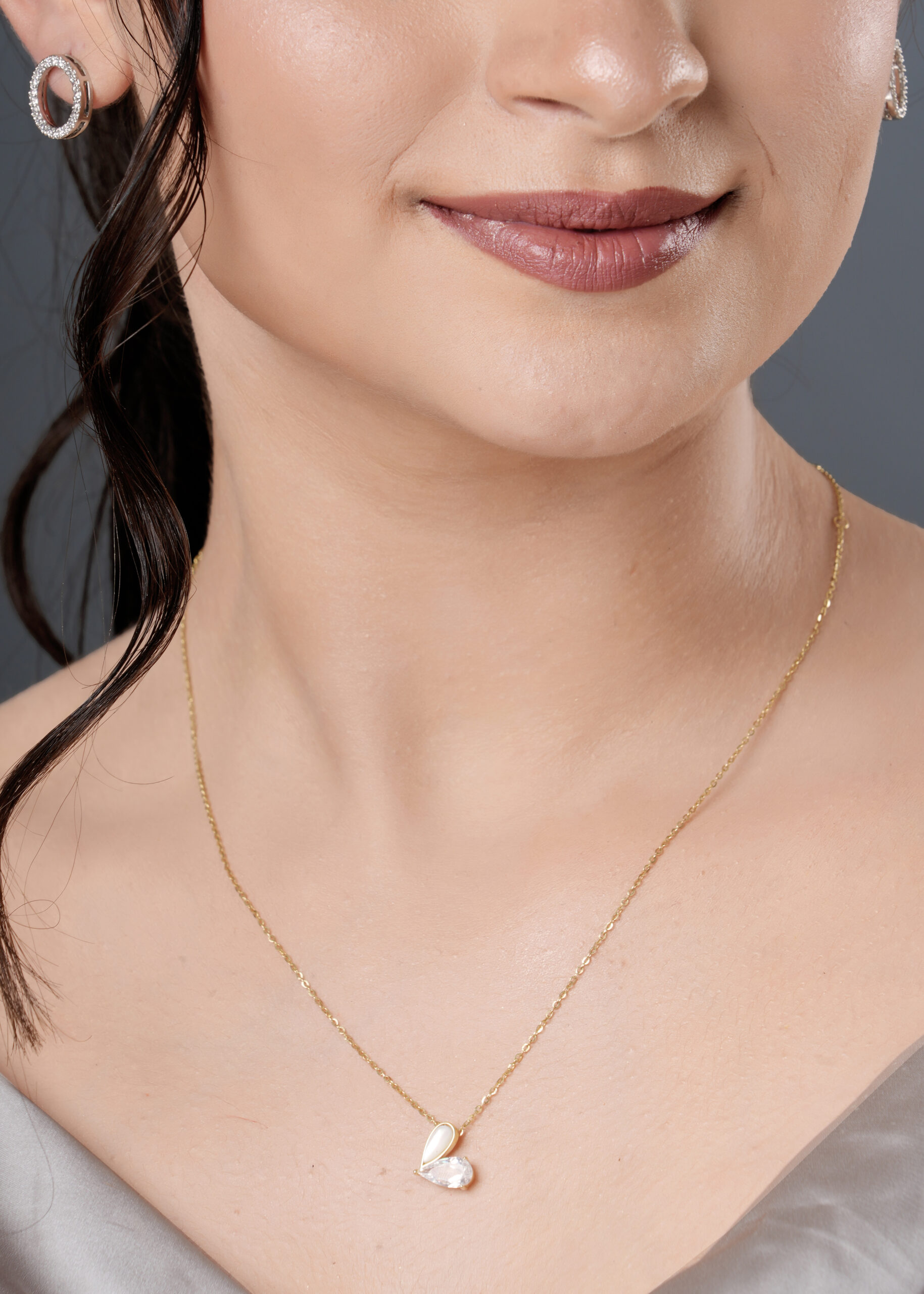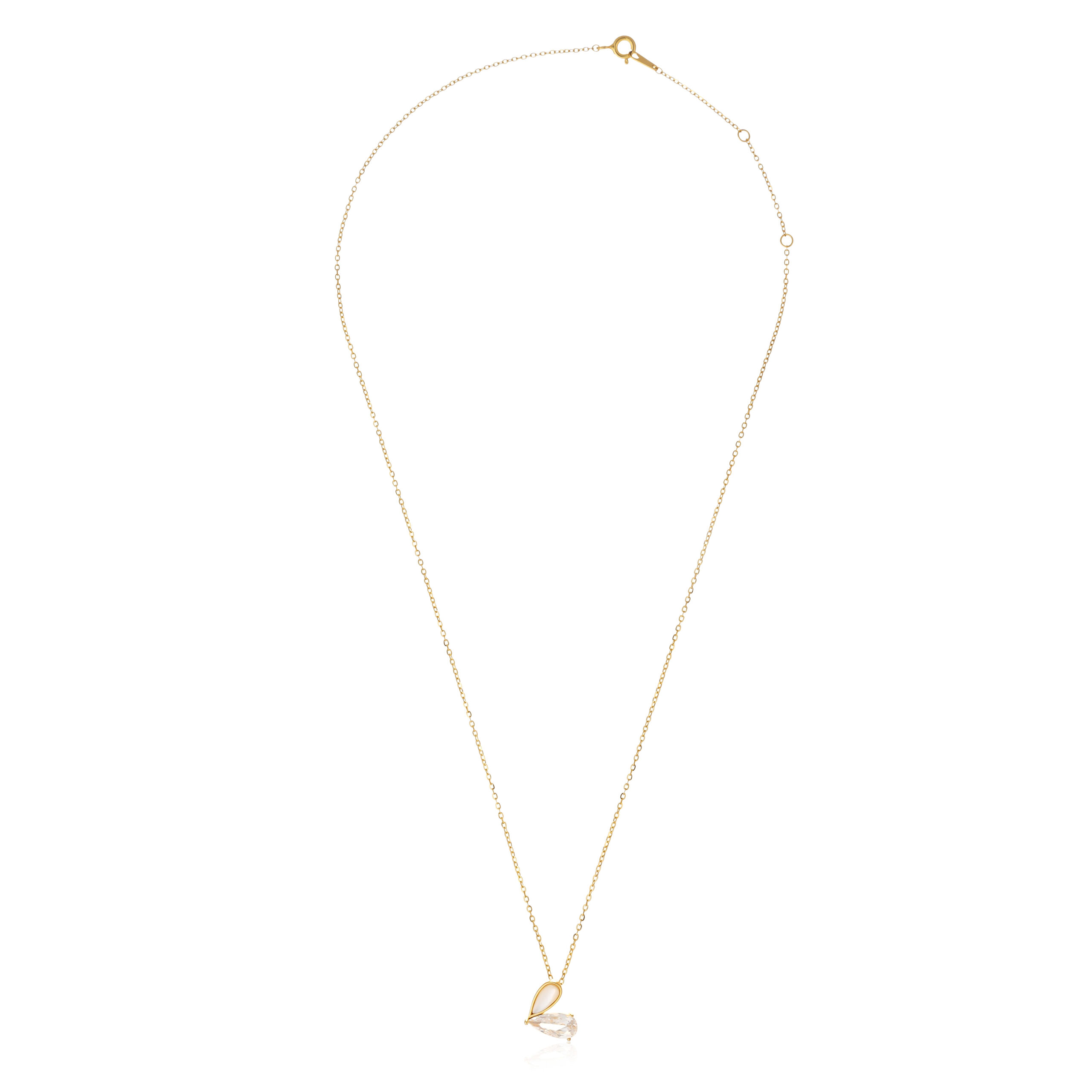 A delicate pendant necklace featuring a beautifully cut crystal in a teardrop shape, framed by a polished gold finish, exuding elegance and timeless beauty.