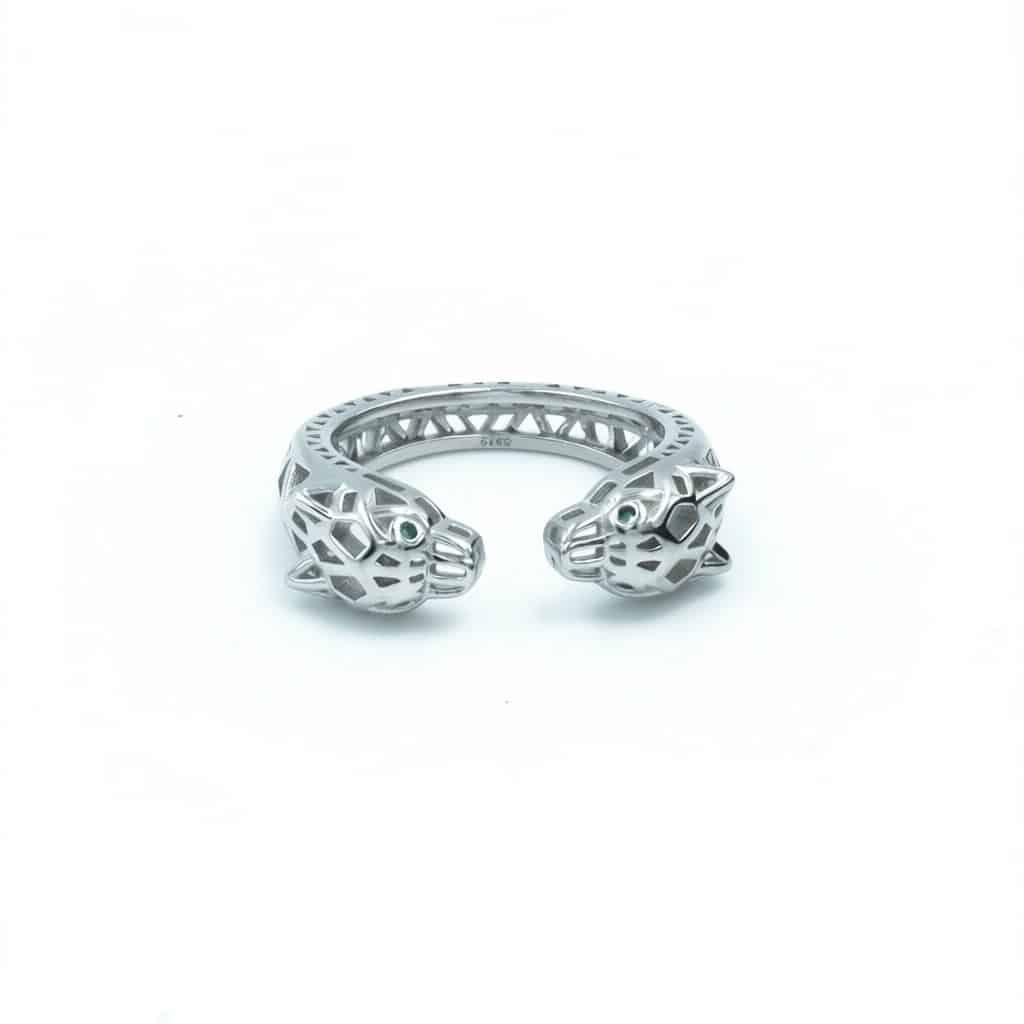 A fierce, contemporary open-band ring featuring two intricately detailed panther heads with emerald-green eyes in 92.5 sterling silver.