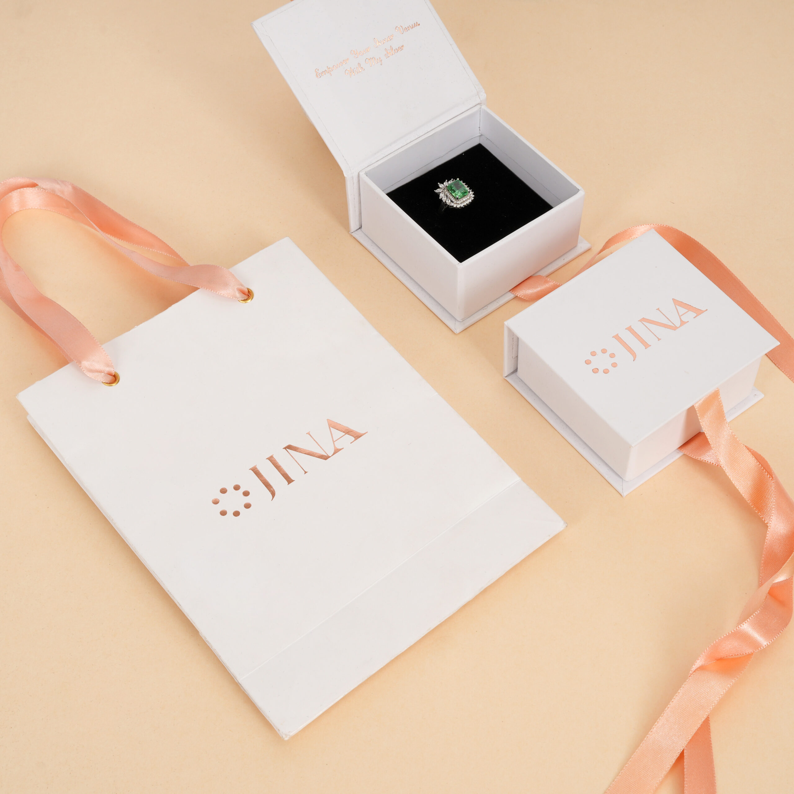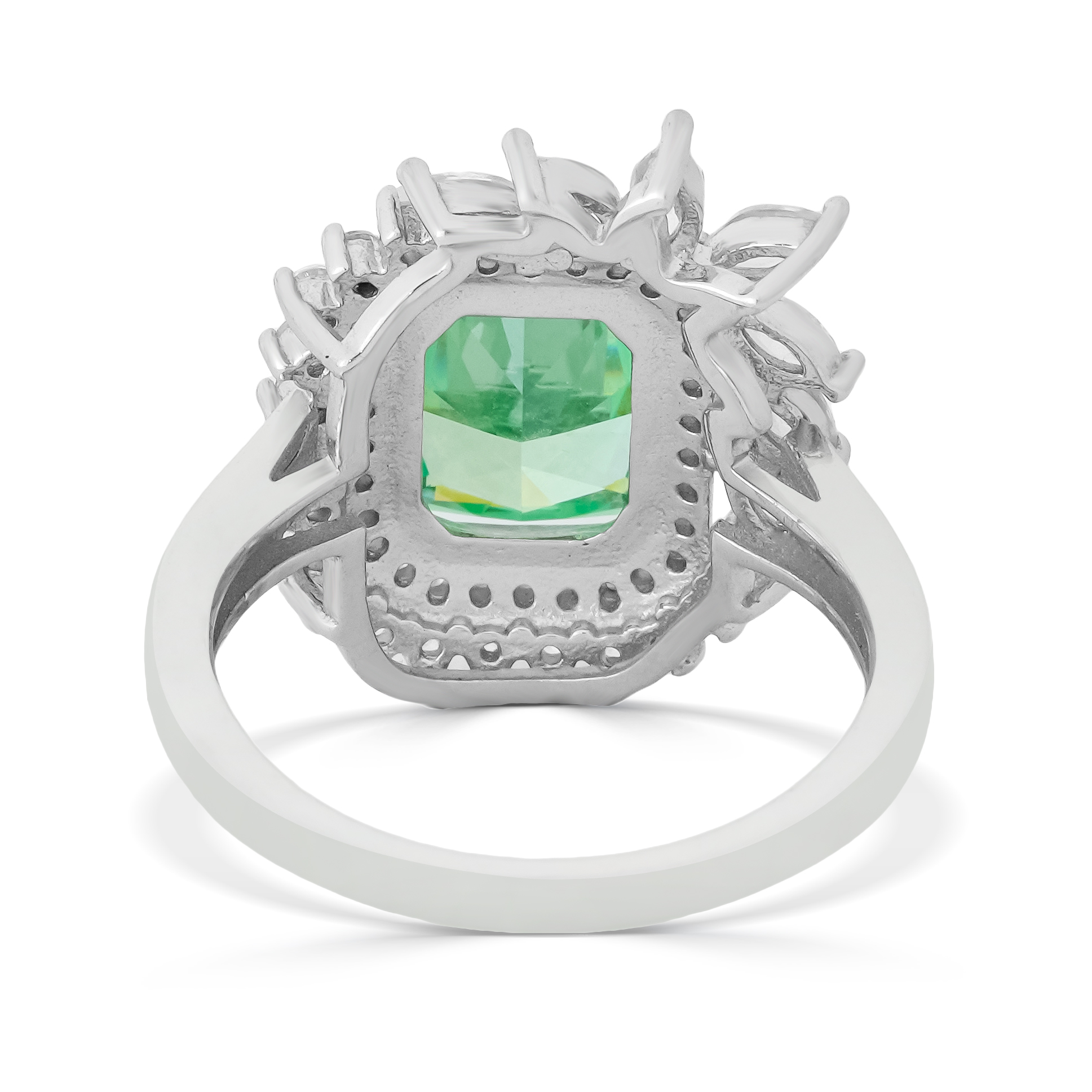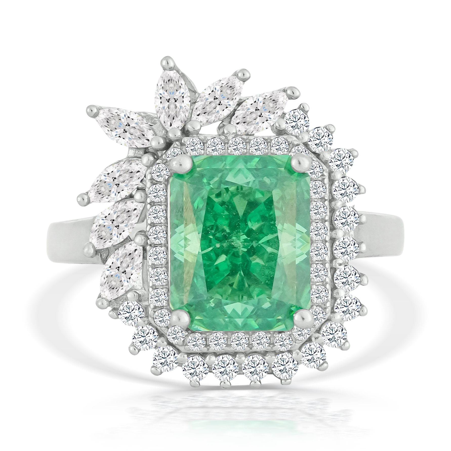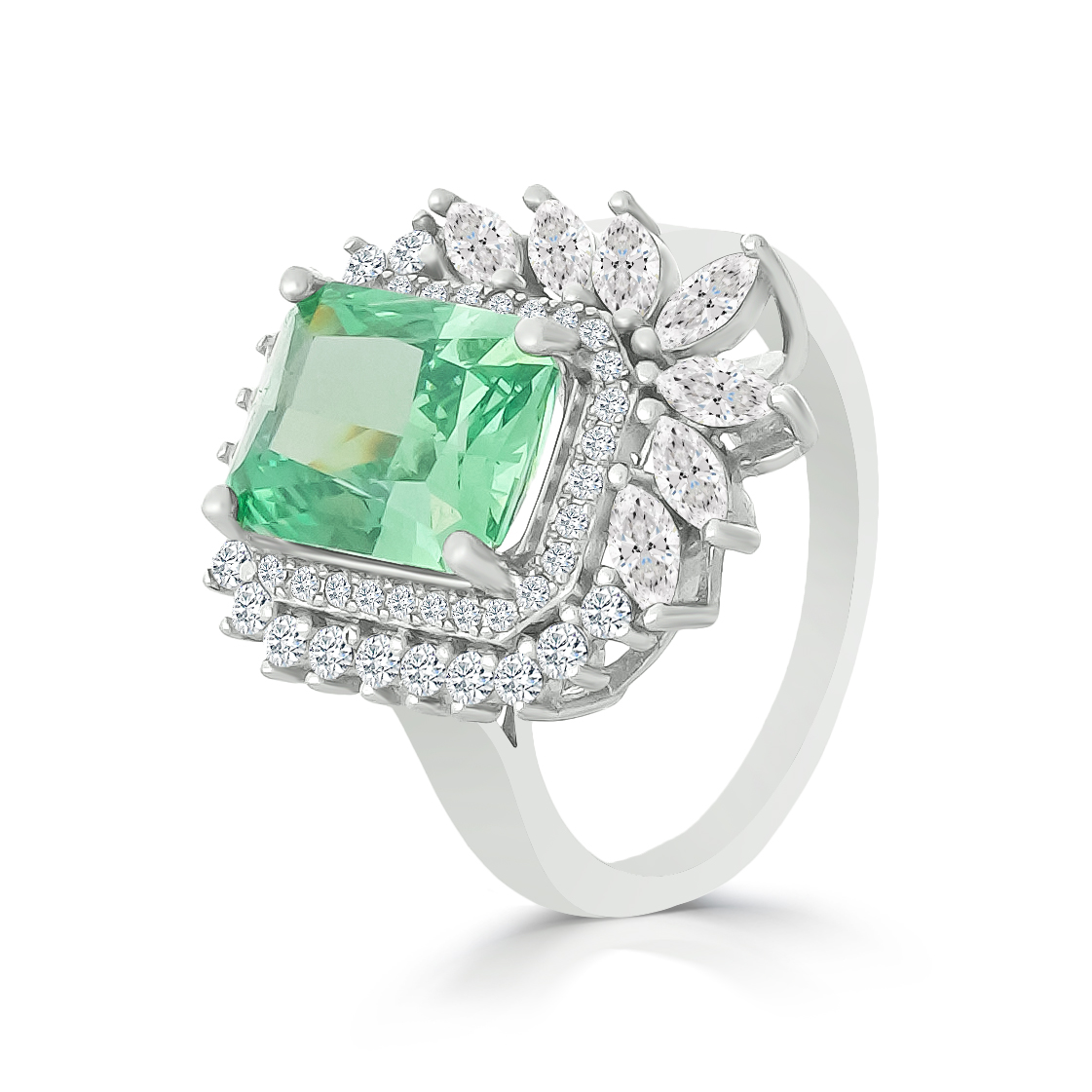A premium 92.5 sterling silver ring featuring a radiant green gemstone surrounded by sparkling cubic zirconia. Perfect for parties, weddings, and everyday glamour.