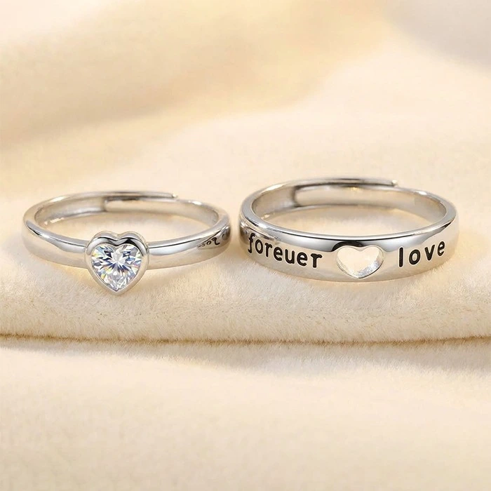 - Design: Couple ring set – one with heart-shaped gemstone, one with “Forever Love” engraving