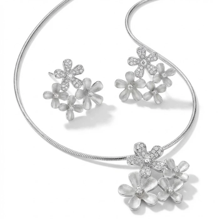 - Earrings Design: Matching four-flower studs, echoing the pendant’s design for a coordinated look