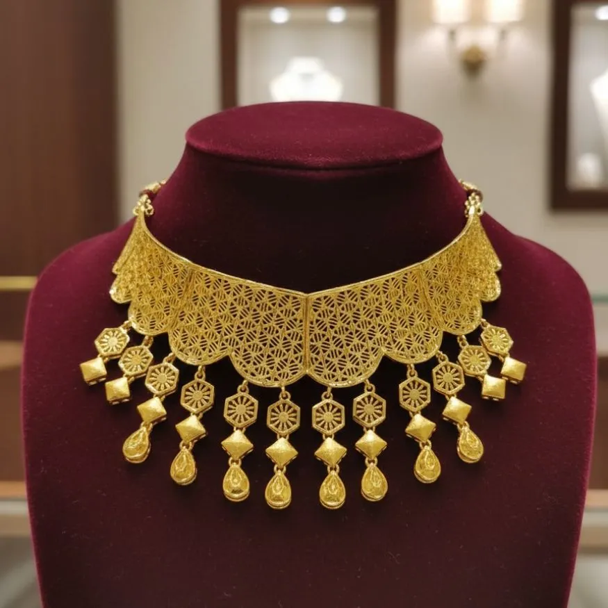 The choker-style necklace sits perfectly on the neckline, giving a bold yet graceful appearance. The unique hexagon design adds a modern twist, while the intricate detailing brings a traditional feel. This combination makes it a perfect choice for weddings, festive celebrations, and party wear.