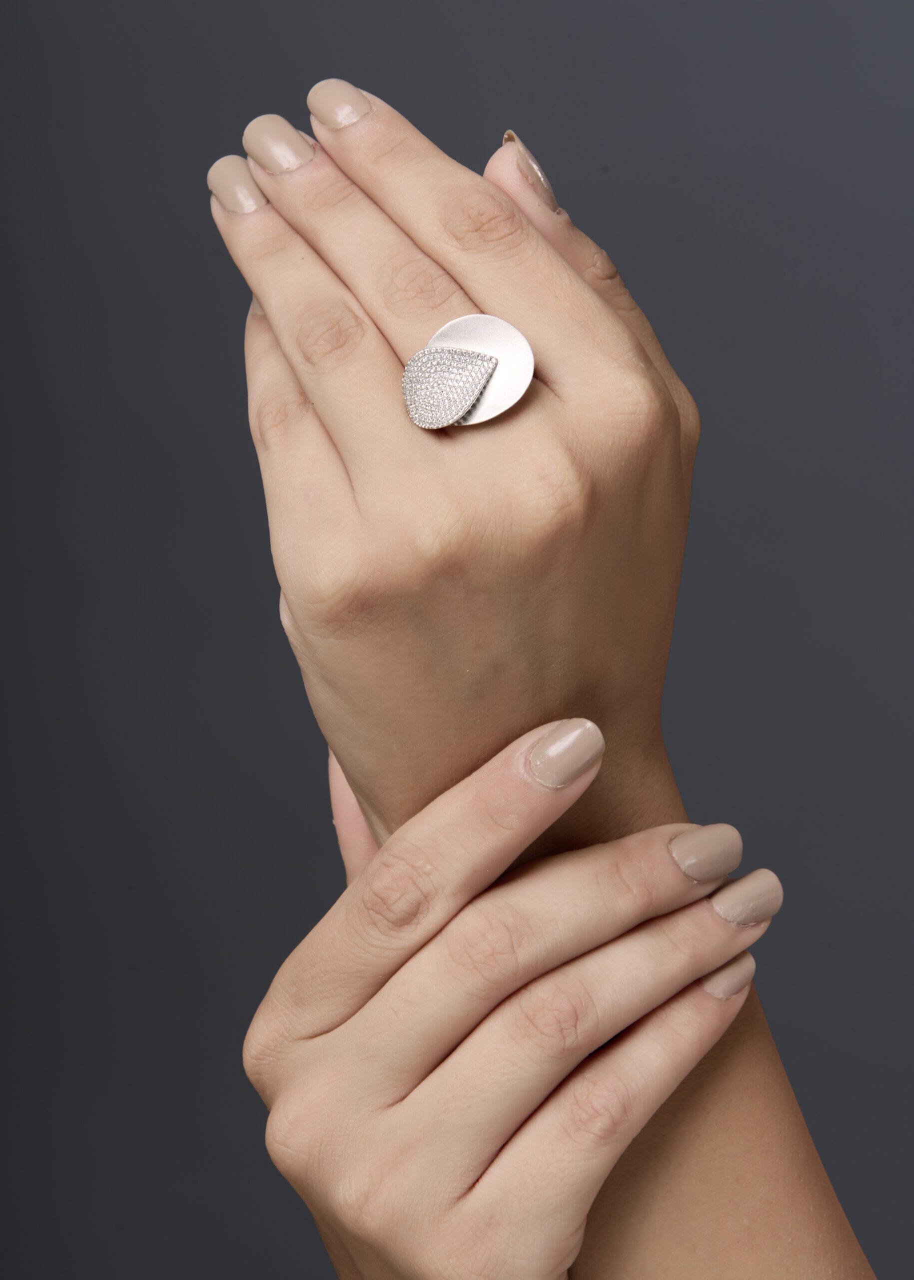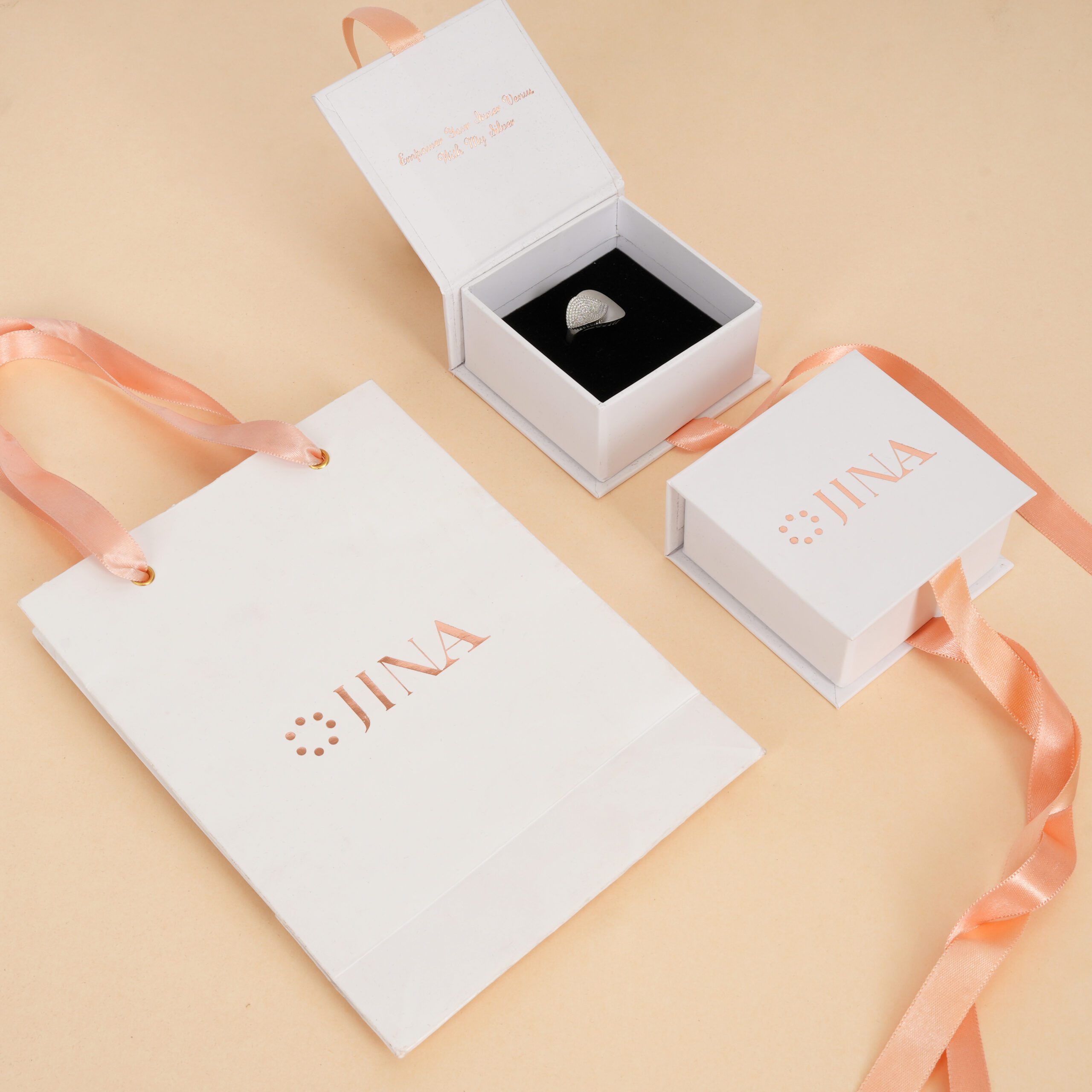 This stunning JINA 92.5 sterling silver ring is the epitome of elegance and luxury. Designed with a unique leaf-inspired motif, the ring features a pave setting of dazzling diamonds that create a striking contrast against the polished silver band. The sophisticated design combines smooth curves with intricate detailing, offering a modern yet timeless piece that is perfect for any special occasion.