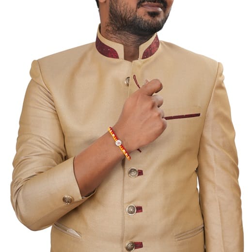 Crafted in auspicious red and yellow wool, this Rakhi features a divine silver-toned Om charm adorned with sparkling stones. It blends traditional values with festive flair, making it a sacred and elegant choice for Raksha Bandhan.