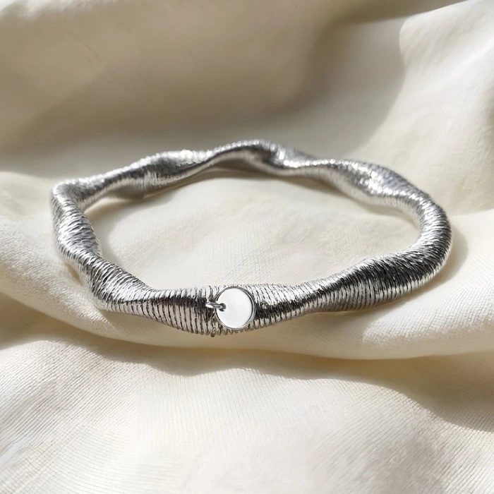 This beautiful Rhodium Finish Italian Bracelet is crafted from 92.5 sterling silver and features an iconic coil design, flexible and stretchable to ensure a snug, secure fit, while its polished, rhodium-finished surface adds modern refinement while its subtle charm disc provides minimalist flair – ideal for daily wear or stacking!