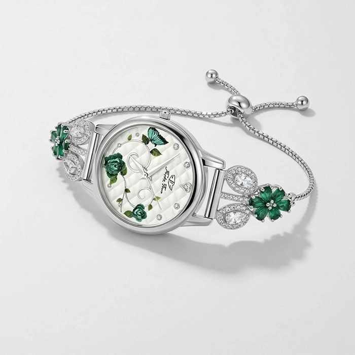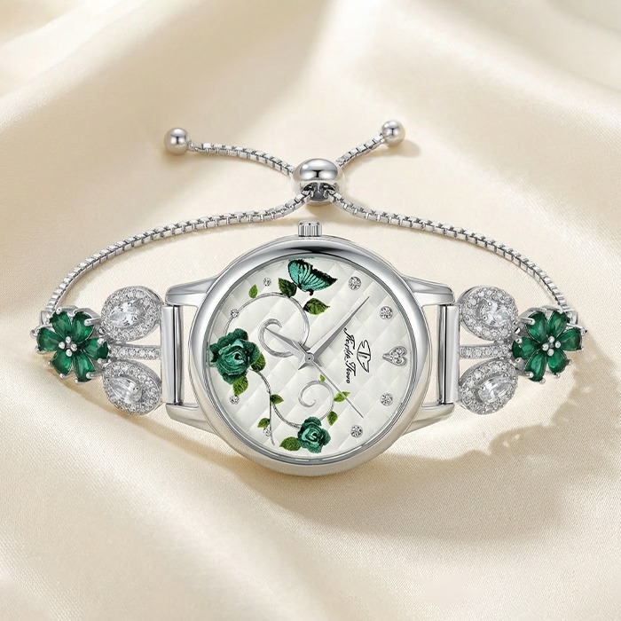 Silver Adjustable Bracelet Watch with Green Floral Accents