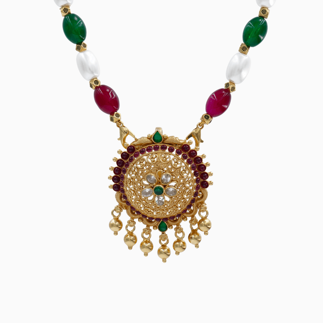 Elevate your style with the Jina Fashion Exclusive Silver Pendant Necklace, a masterpiece of traditional craftsmanship. This intricately designed necklace features a stunning circular pendant embellished with ruby-red, emerald-green, and sparkling crystal-like accents. The beads include an elegant combination of pearls, green, and red gemstones that add a pop of color to your attire. The dangling golden bells lend a touch of charm and sophistication to the necklace, making it perfect for festive occasions, weddings, or special celebrations.
