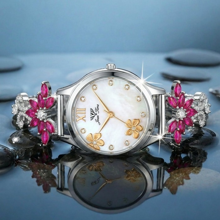 A luxurious 92.5 sterling silver floral bracelet watch featuring pink crystal blooms, mother-of-pearl dial, and elegant detailing — perfect for festive and special occasions.