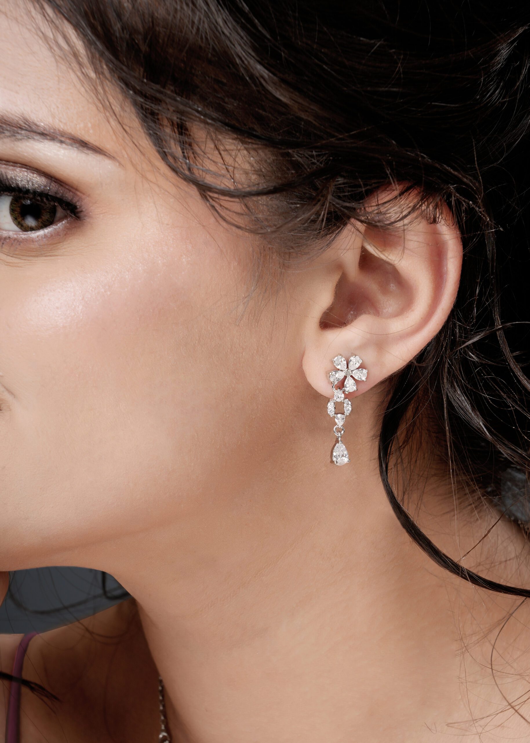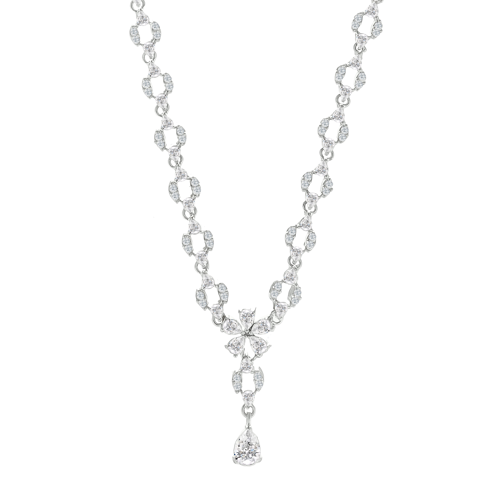Embrace timeless elegance with this exquisite sterling silver diamond necklace and earrings set. The necklace is adorned with an intricate pattern of linked diamond clusters, creating a sparkling, fluid design that enhances your neckline. The centerpiece of the necklace features a stunning teardrop-shaped diamond pendant that exudes luxury and sophistication. Complementing the necklace, the earrings mirror the design with a striking diamond cluster and a matching teardrop diamond at the bottom. Crafted from premium sterling silver, this set is designed to stand out, making it an ideal accessory for weddings, parties, or formal gatherings. With its delicate yet bold design, this jewelry set will be cherished for years to come.