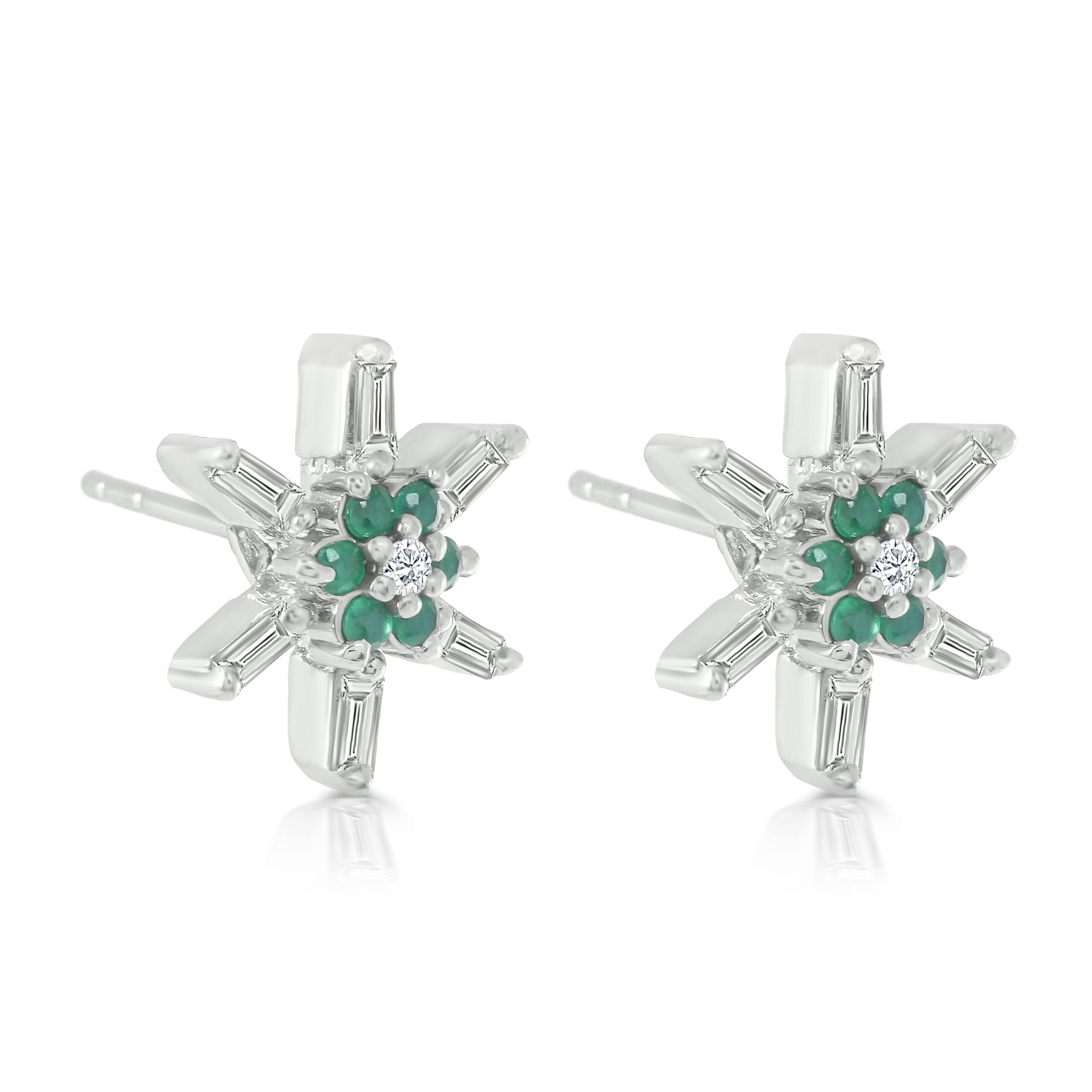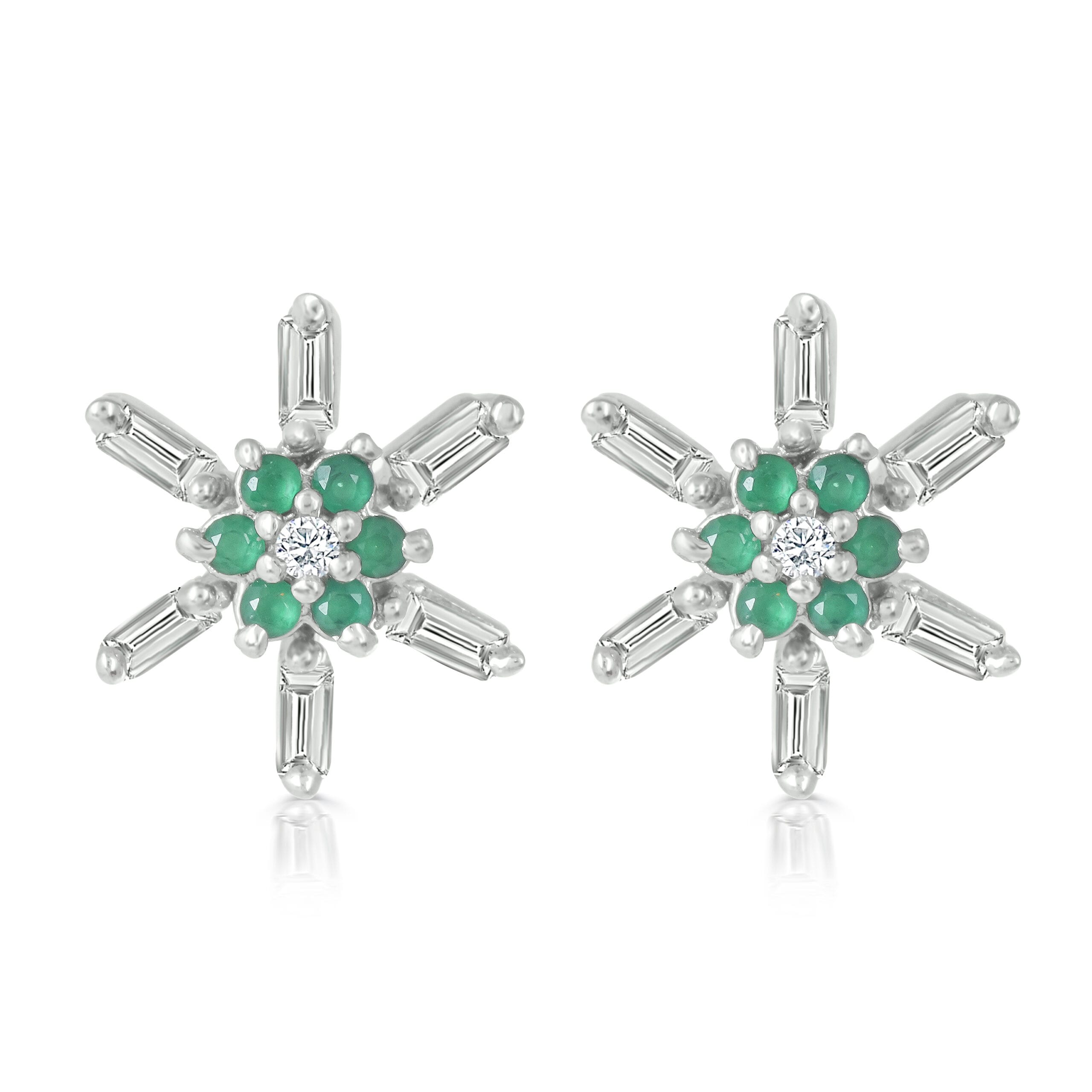 Elegant sterling silver flower stud earrings featuring emerald stones, a central cubic zirconia, and baguette-cut accents. Perfect for adding a chic touch.