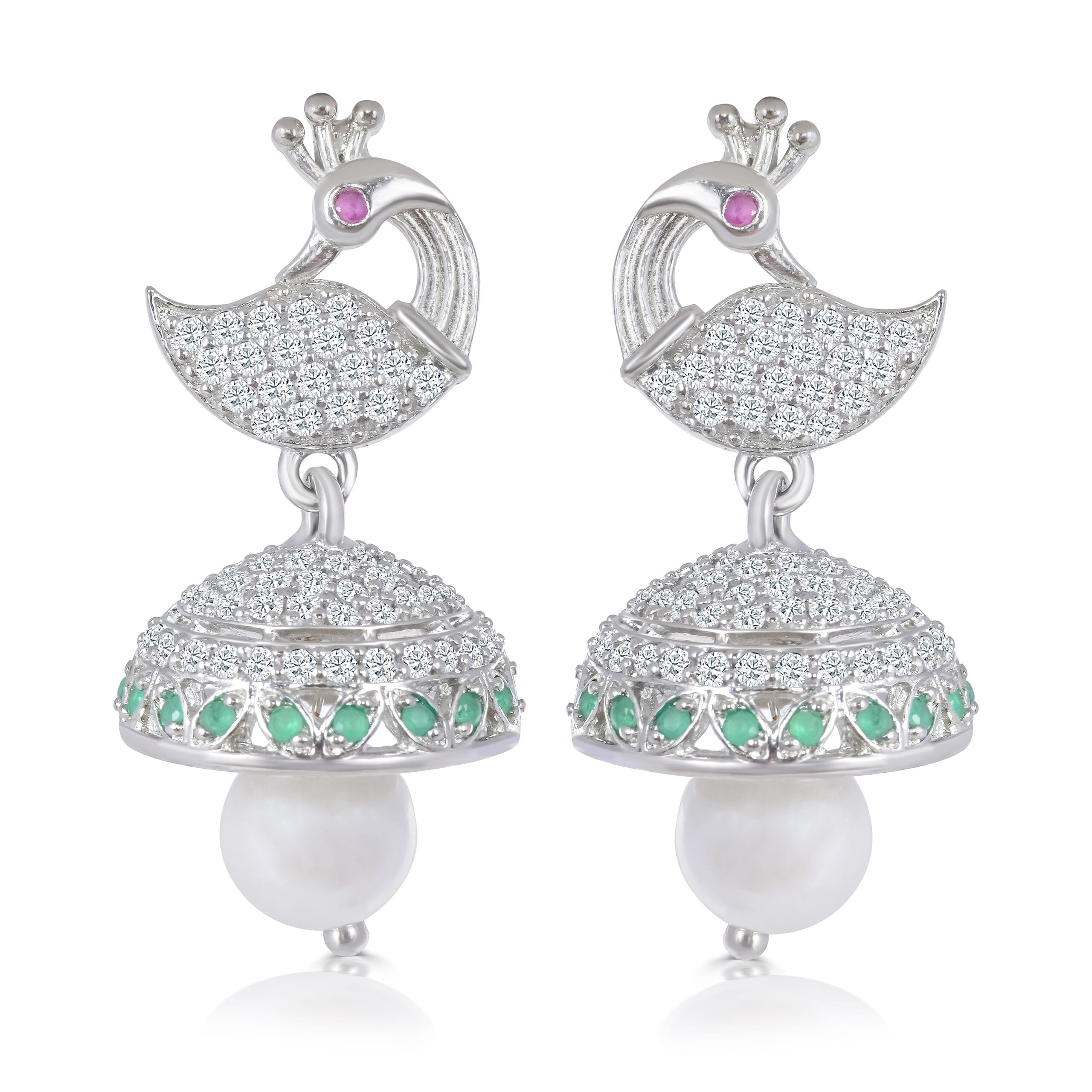 Sterling silver peacock design drop earrings with sparkling cubic zirconia, green stones, and lustrous pearls. A beautiful blend of elegance and charm.